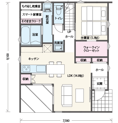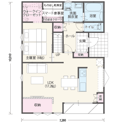 リビング+主寝室+水廻りを1階に配置。平屋のように暮らせるから、掃除や洗濯などの家事が格段に楽になって、家族とも家事を共有しやすくなります。